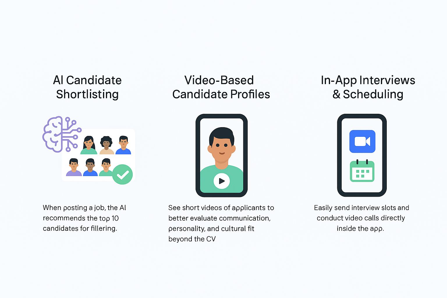 Streamline your hiring process by scheduling interviews and conducting video calls directly in-app , no third-party tools, just smooth and seamless communication.